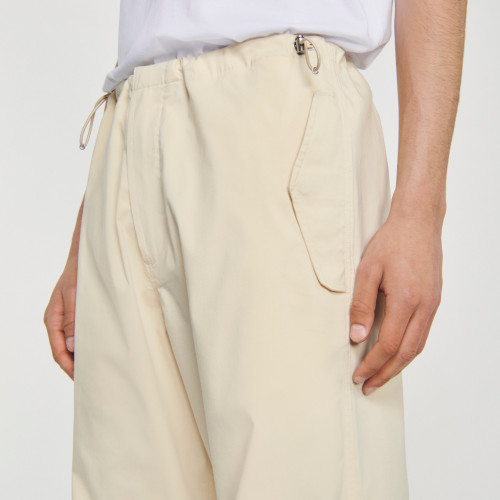 Parachute pants with a baggy fit, side pockets, and elastics with cord locks at the waist and ankles.