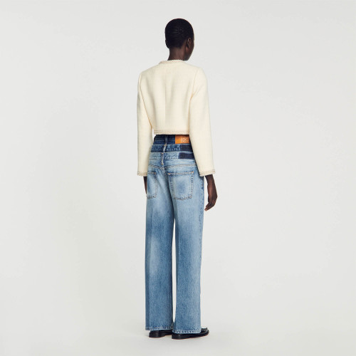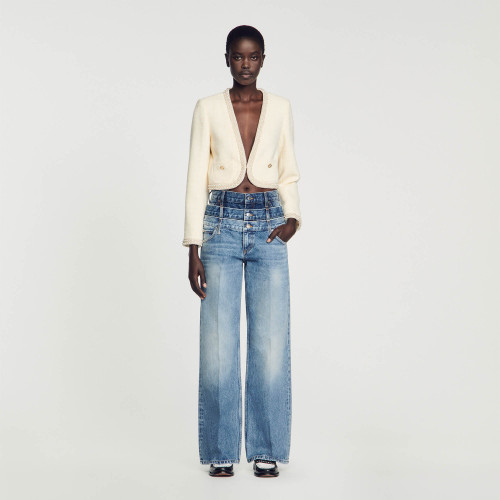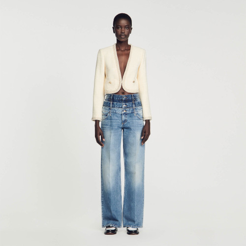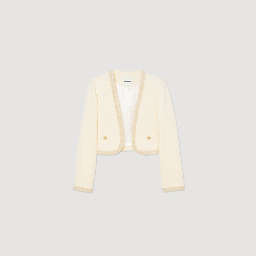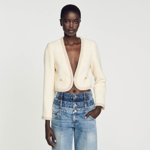 Cropped tweed jacket with long sleeves, patch pockets and beaded trims.
