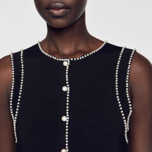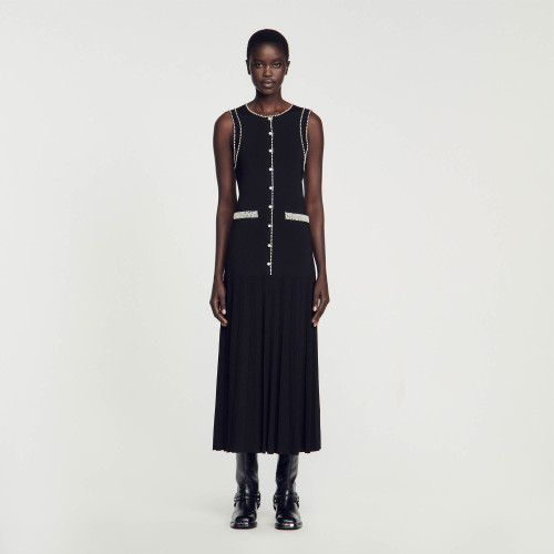 Sleeveless knit midi dress with a round neck, beaded button fastening and decorative flared bottom.